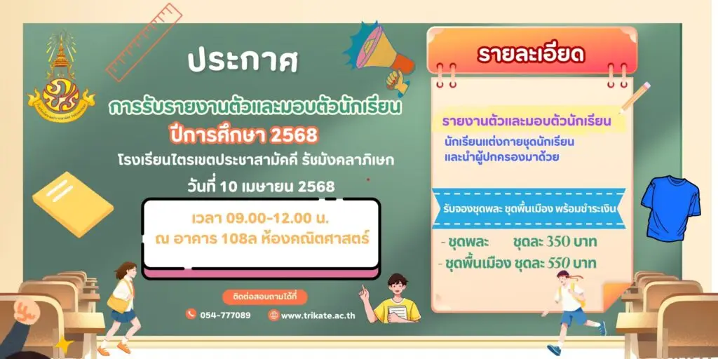 ประกาศโรงเรียนไตรเขตประชาสามัคคี รัชมังคลาภิเษก เรื่อง การเลื่อนการรับรายงานตัวและมอบตัวนักเรียนเข้าศึกษาชั้นมัธยมศึกษาปีที่ 1 และชั้นมัธยมศึกษาปีที่ 4 ปีการศึกษา 2568